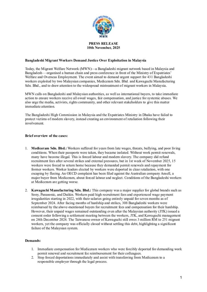 Media References: ABC News (Australia): “Australian glove-maker Ansell accused of exploiting workers” (Sept 2025). Click for news link The Daily Star (Bangladesh): “Dream turns into despair for deported Mediceram workers” (6 Nov 2025). Click for news link AP News: “Migrant workers from Kawaguchi seek unpaid wages, partial repayments arranged” (May 2025). Click for news link