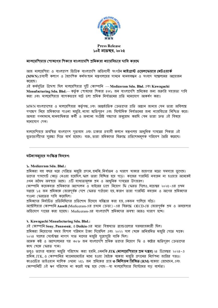 MWN calls on Bangladeshi and Malaysian authorities, as well as international buyers, to take immediate action to ensure workers receive all owed wages, fair compensation, and justice for systemic abuses. We also urge the media, activists, rights community, and other relevant stakeholders to give this matter immediate attention. The Bangladeshi High Commission in Malaysia and the Expatriates Ministry in Dhaka have failed to protect victims of modern slavery, instead creating an environment of retaliation following their involvement.